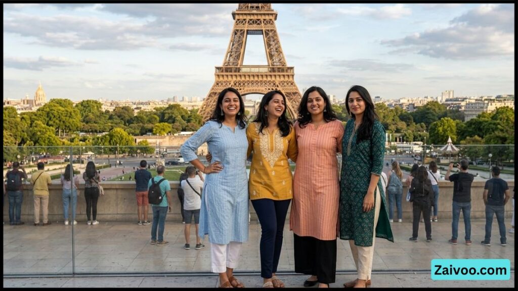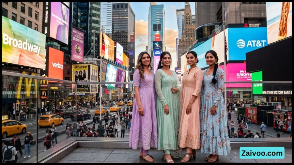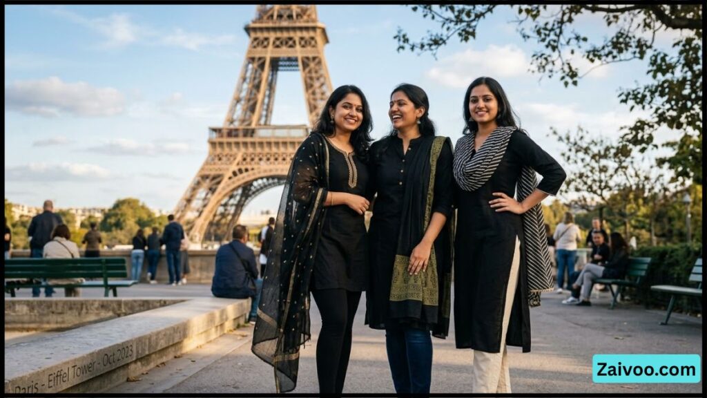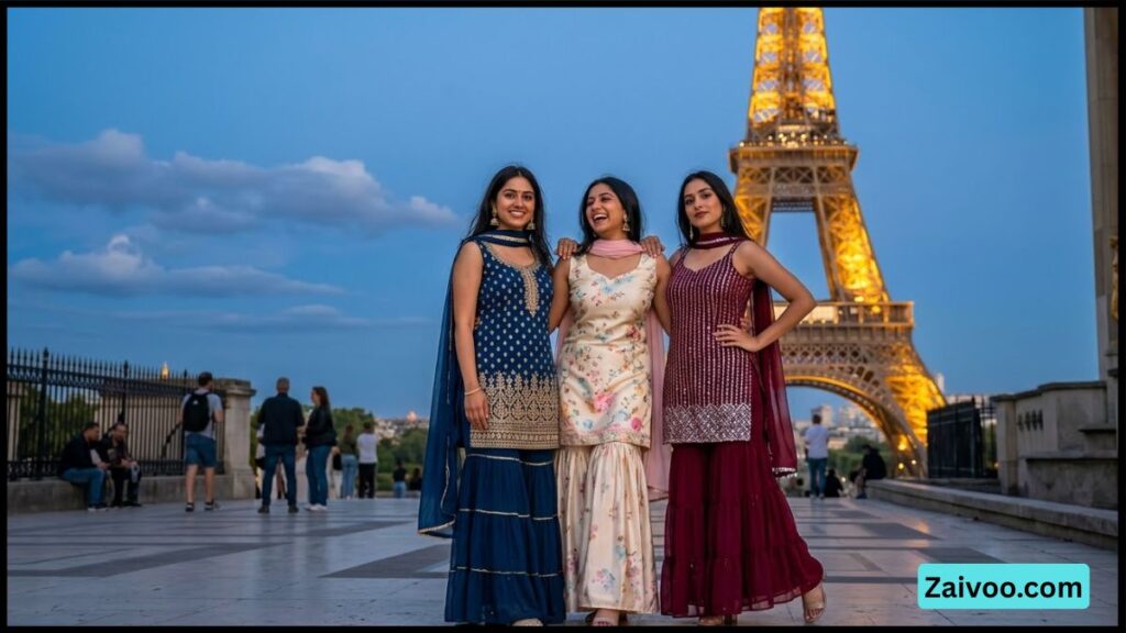 अगर आप traditional से थोड़ा हटकर कुछ try करना चाहती हो तो Indo-western outfit आपके लिए best है। Cape style kurti, jacket style dress या asymmetrical cuts आजकल बहुत viral हैं। ये outfits आपको modern और stylish look देते हैं और crowd में अलग दिखाते हैं। इसके साथ minimal accessories रखो ताकि outfit ही highlight रहे।