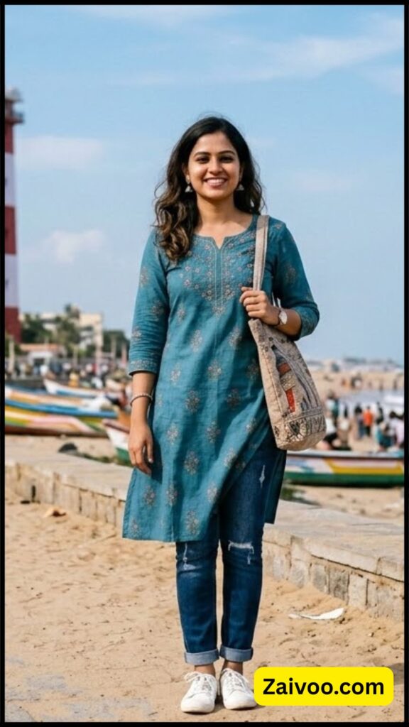 अगर आपको simple लेकिन stylish look चाहिए, तो kurti के साथ jeans एक perfect option है। Short kurti और denim jeans का combination college, shopping या casual outing के लिए बहुत अच्छा लगता है।