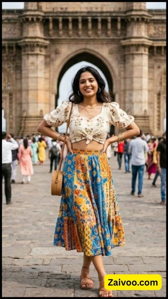 Crop top और long skirt का combination festive और party look के लिए बहुत अच्छा माना जाता है। यह outfit modern भी लगता है और traditional touch भी देता है।