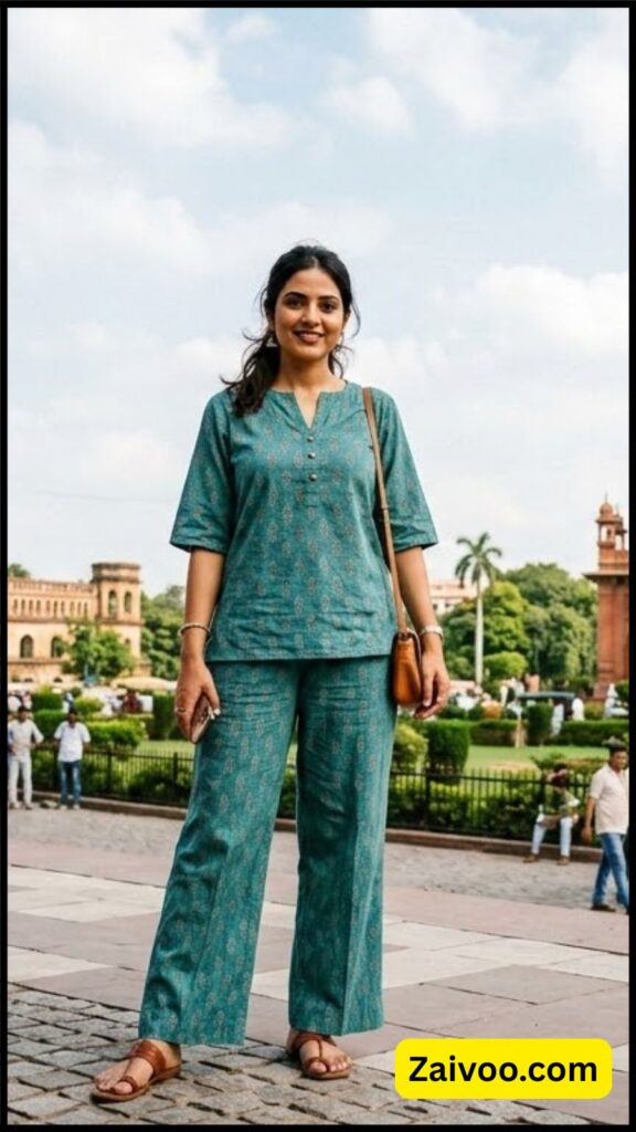 आजकल co-ord sets बहुत trend में हैं। इसमें top और bottom दोनों matching होते हैं, इसलिए styling में ज्यादा time नहीं लगता। Casual outing, brunch या travel के लिए यह outfit काफी stylish लगता है।