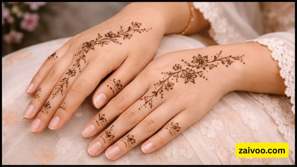 मिनिमल मेहंदी डिजाइन में पतली लाइनों और छोटे-छोटे पैटर्न का इस्तेमाल होता है।