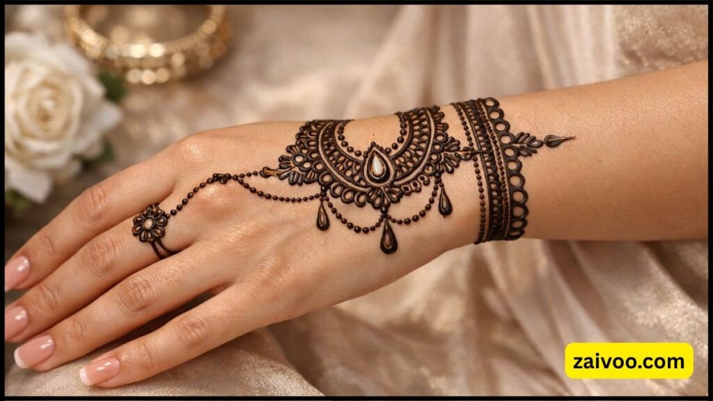 इस डिजाइन में कलाई पर ब्रेसलेट जैसा पैटर्न बनाया जाता है जो हाथ को ज्वेलरी जैसा लुक देता है।