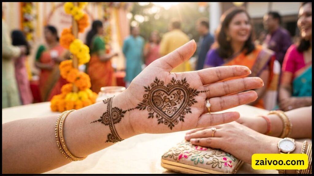 हार्ट शेप वाला मेहंदी डिजाइन कपल्स और खास मौकों के लिए बहुत पसंद किया जाता है।