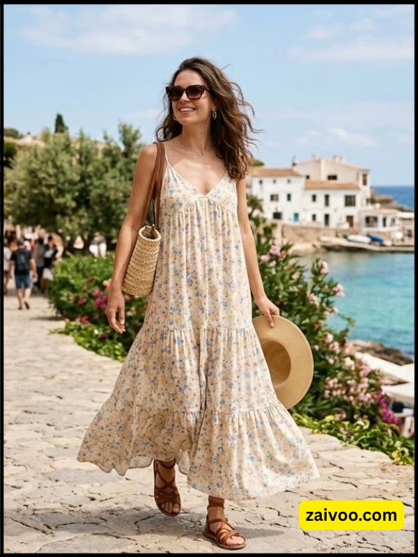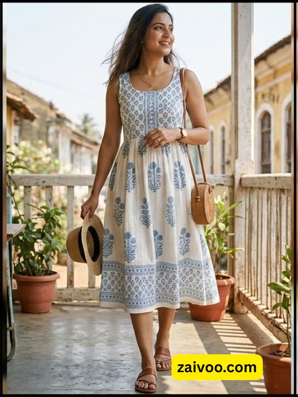 फ्लोरल प्रिंट वाली ड्रेस गर्मियों की सबसे पसंदीदा ड्रेसेज़ में से एक मानी जाती है। हल्के रंगों के कपड़े पर बने फूलों के डिजाइन एक ताजगी भरा और खुशमिजाज लुक देते हैं। कॉलेज जाने वाली लड़कियों से लेकर आउटिंग पर जाने वाली महिलाओं तक, यह ड्रेस लगभग हर उम्र के लिए अच्छी लगती है। खास बात यह है कि फ्लोरल समर ड्रेस कॉटन या रेयॉन फैब्रिक में आती है, जिससे गर्मियों में शरीर को काफी आराम मिलता है और पसीना भी कम महसूस होता है।