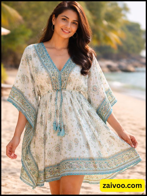 काफ्तान ड्रेस ढीले और चौड़े डिजाइन की होती है, इसलिए यह गर्मियों में सबसे आरामदायक ड्रेसेज़ में से एक मानी जाती है। यह ड्रेस खासकर घर पर या बीच ट्रिप के दौरान पहनने के लिए बहुत अच्छी होती है। काफ्तान का फैब्रिक आमतौर पर हल्का और मुलायम होता है, जिससे शरीर को ठंडक मिलती है।